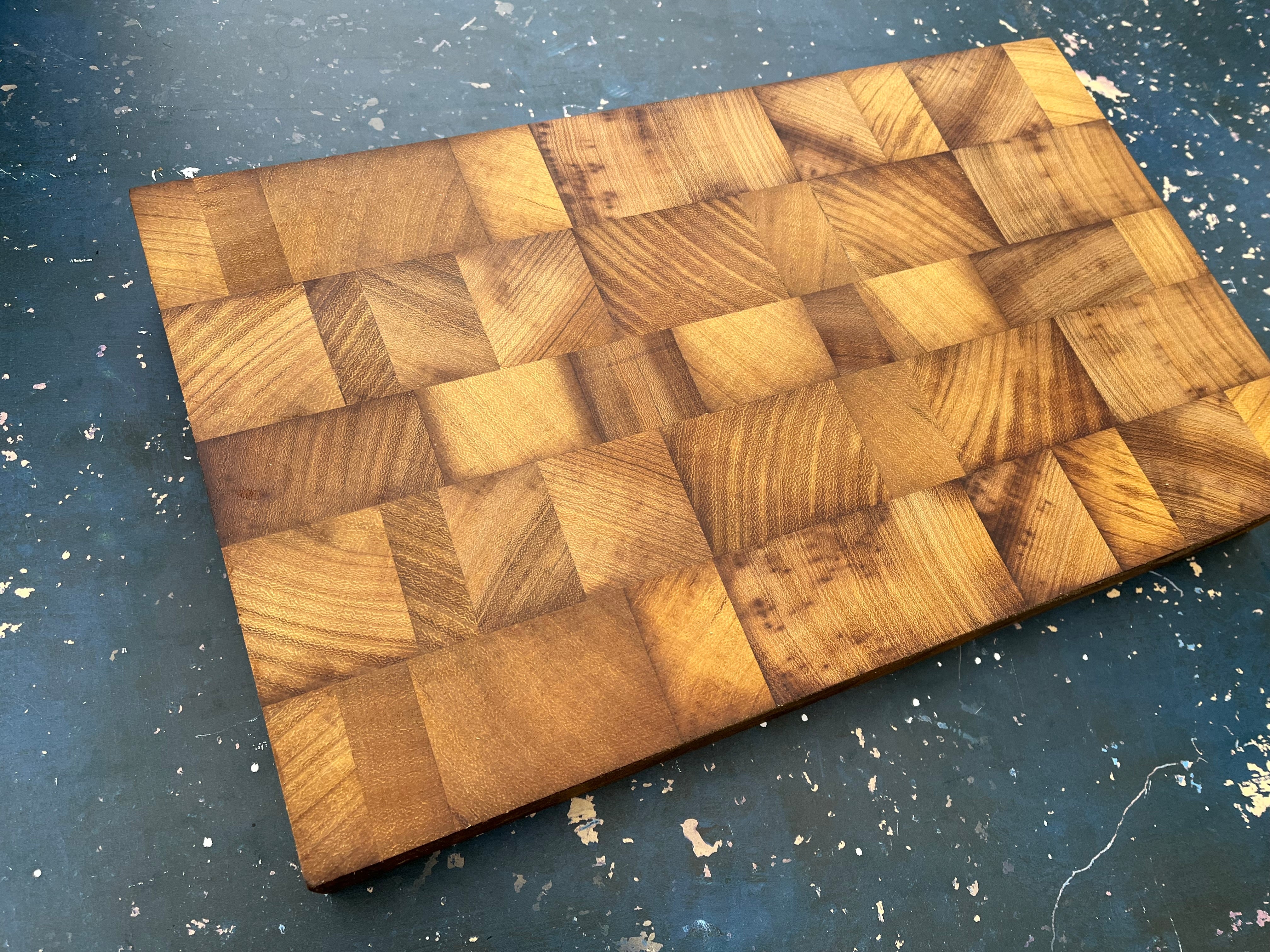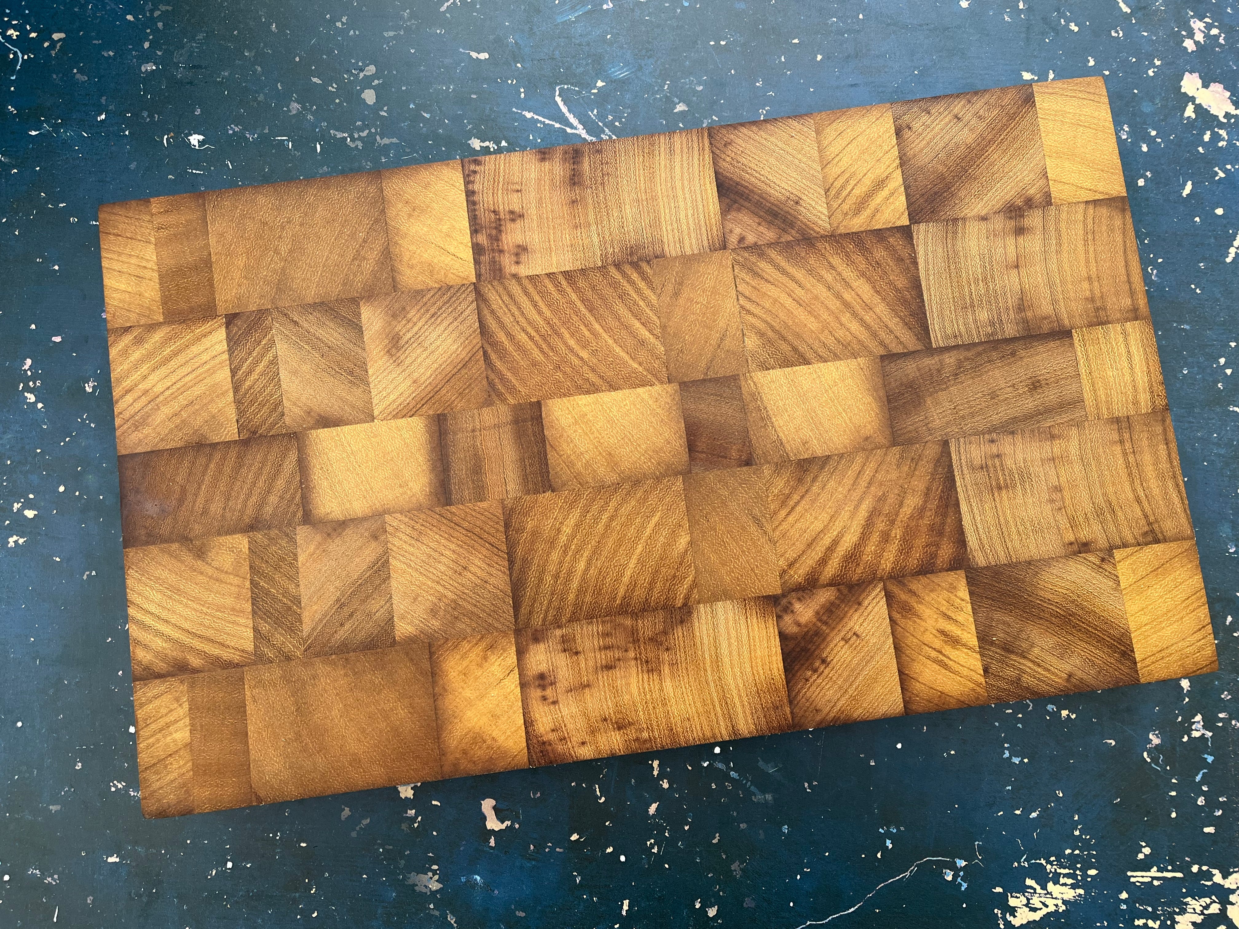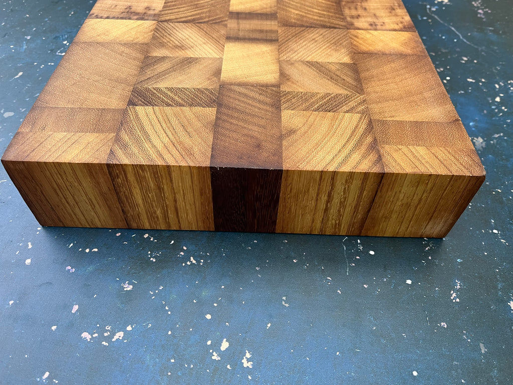 Randomised pieces of end grain Iroko making a unique patterned board
